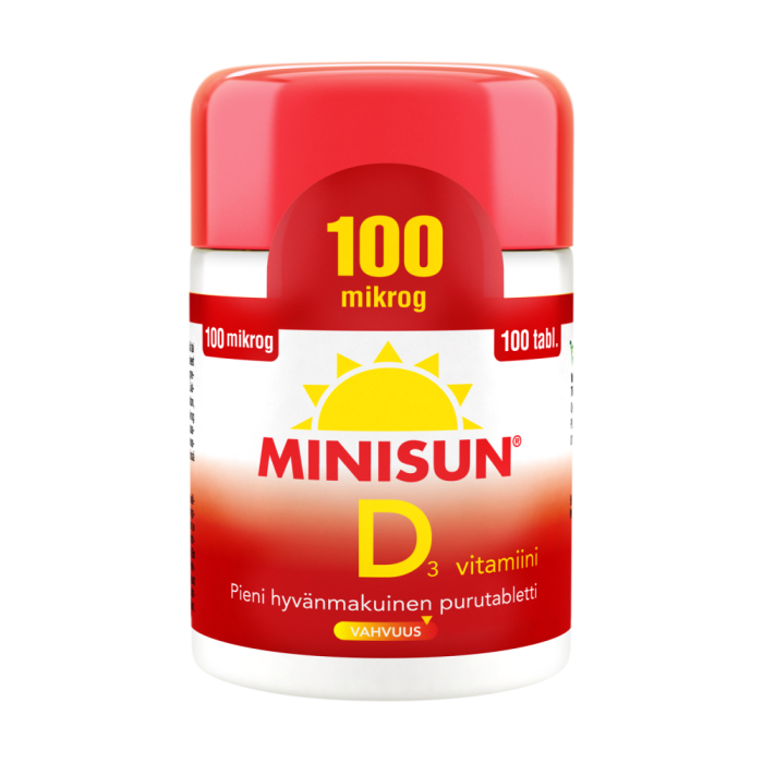 En liten, välsmakande tuggtablett. D3-vitaminpreparat. Innehåller lättupptagligt D3-vitamin och tabletterna är lätta att dosera. En tuggtablett om dagen räcker. Dosering: För vuxna och barn över 10 år: 1 tablett dagligen: 1 tuggtablett dagligen. Tabletten kan tuggas, sugas eller sväljas. Innehåll: En tablett innehåller: D3-vitamin (kolekalciferol) 100 mikrog (4000 IU), 2000 % av referensvärdet. Förteckning över ingredienser: Sötningsmedel (sorbitol, xylitol), klumpförebyggande medel (magnesiumsalter av fettsyror), D3-vitamin (kolekalciferol). Innehåller sötningsmedel. Överdriven konsumtion kan ha laxerande verkan. Gluten-, laktos-, mjölk-, soja- och gelatinfri. Graviditet och amning: Ersätter inte en balanserad och mångsidig kost eller en hälsosam livsstil. Doseringen får ej överskridas. Förvaras oåtkomligt för barn. Förvaras skyddad från ljus och fukt. Rekommenderas inte för barn under 11 år.